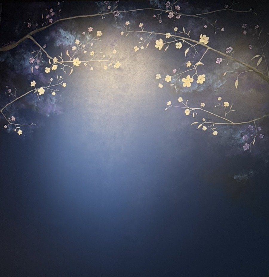 Opus Business Park toivoi Roihuvuoren kirsikkapuita lounasravintolaansa, jonne maalasin aiemmin myös maiseman Herttoniemenrannasta. Asiakas toivoi että sininen brändiväri pidetään pohjana ja että maalaus pidetään mahdollisimman ympärivuotisena. Toteutin maalauksen asiakkaan brändiväreillä ja sisustuksen väreillä. Muotoilin osan kukista muotoilupastalla. Maalaus on verhoilla eristettävässä kabinetissa ja seinän edustalla on spotti valot jotta se toimii myös kivana kuvaustaustana.